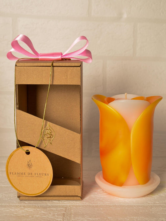 Świeca kielich kwiatu, geometryczna, zapachowa - żółto-czerwona - 40h, pudełko prezentowe - pomysł na romantyczny prezent, ozdoba kominka