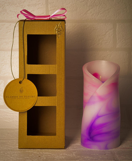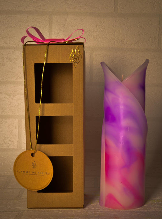 Ręcznie robiona świeca kolumnowa kielich kwiatu, stożkowa, zapachowa - fioletowo-różowy - 70h, pudełko prezentowe - kolorowa ozdoba na stół