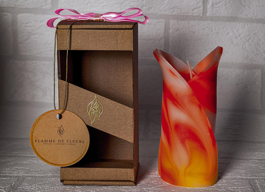Świeca kielich kwiatu, geometryczna, zapachowa - pomarańczowo-czerwona -20cm, pudełko prezentowe -ozdoba na stół do domu, pomysł na urodziny