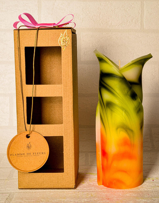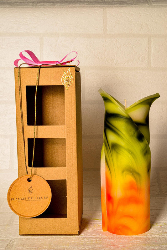 Świeca kielich kwiatu, geometryczna, zapachowa - zielono-pomarańczowa - 70h, pudełko prezentowe - ozdoba na stół do domu, pomysł na prezent