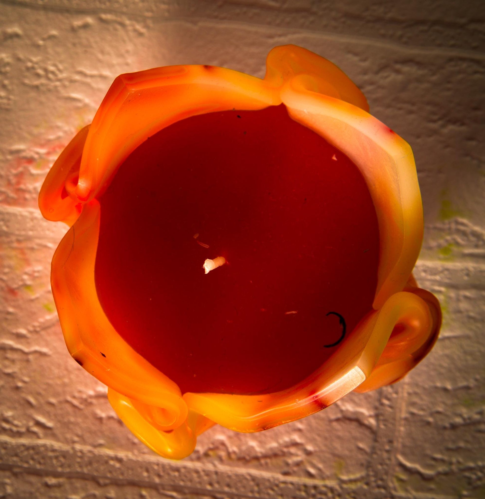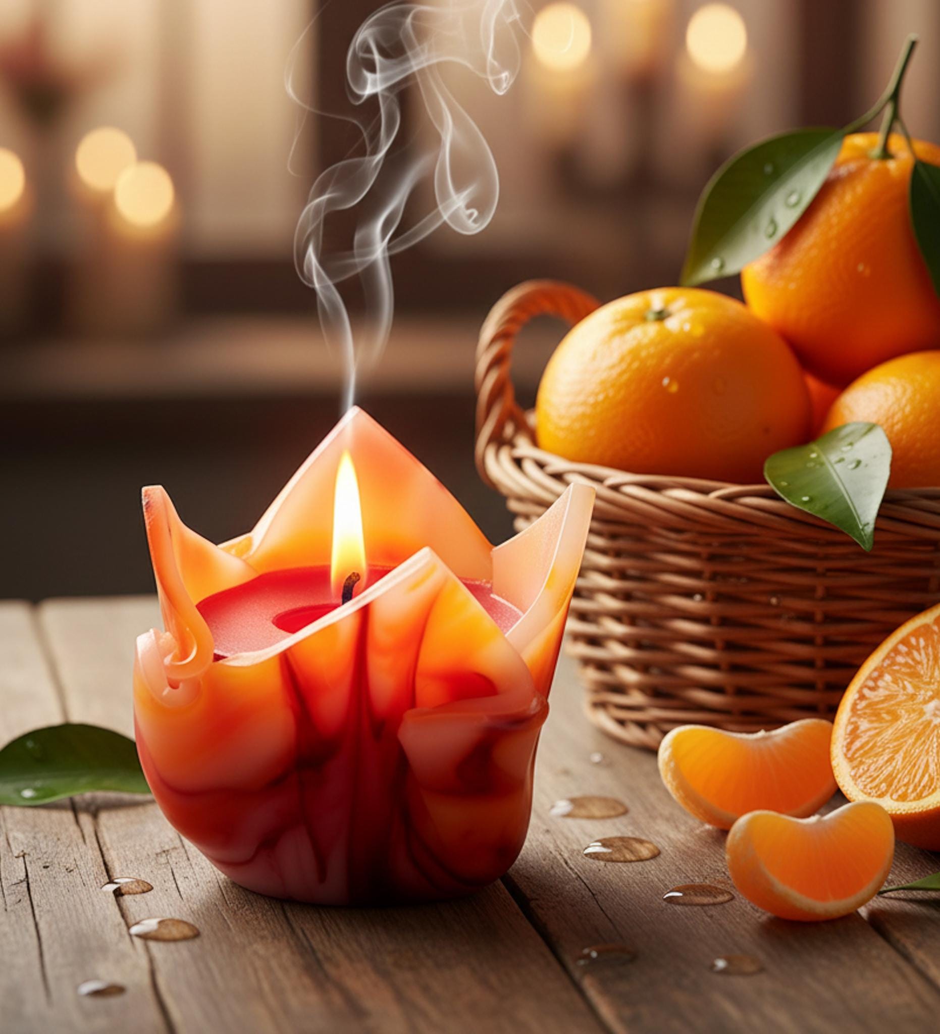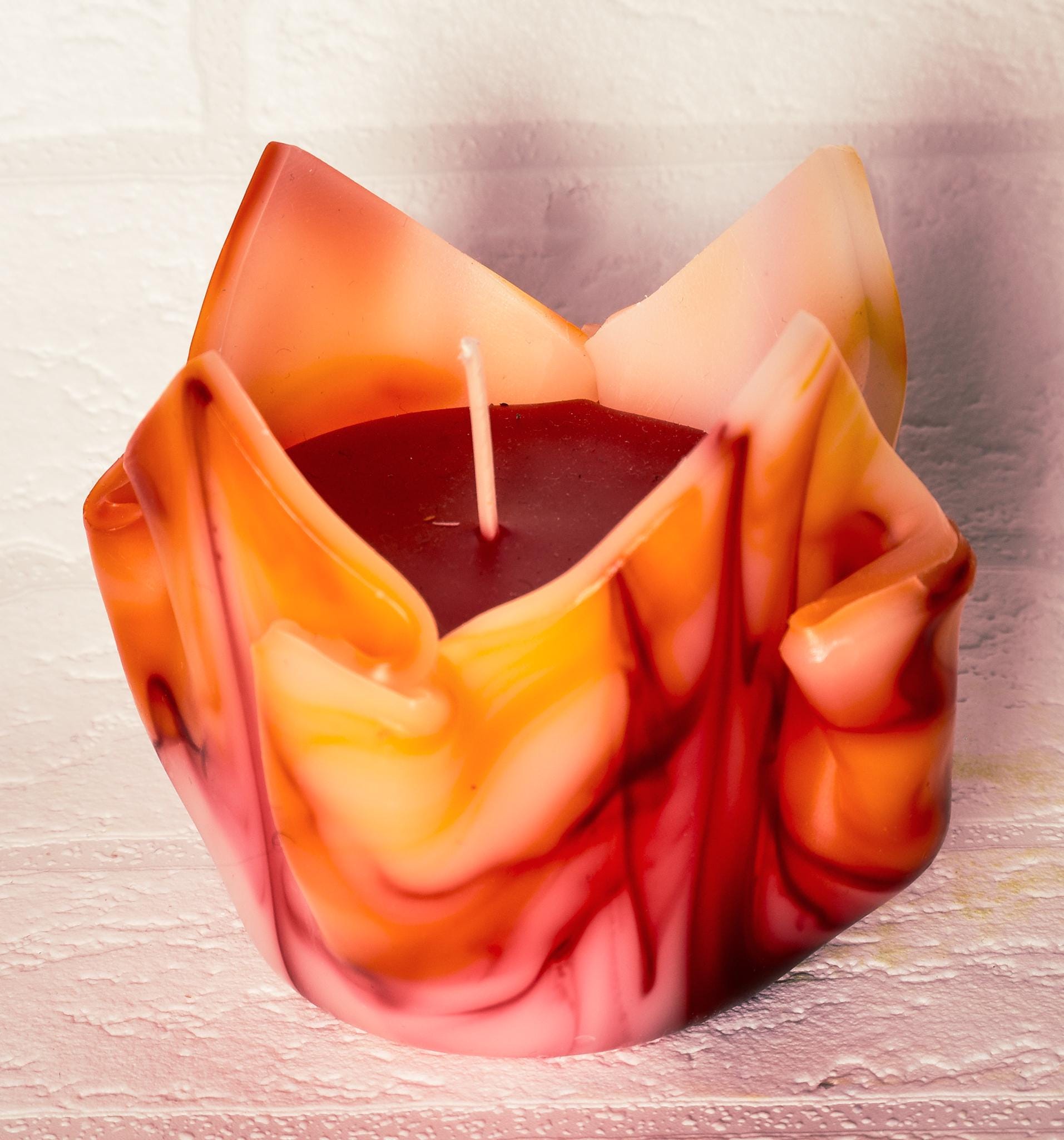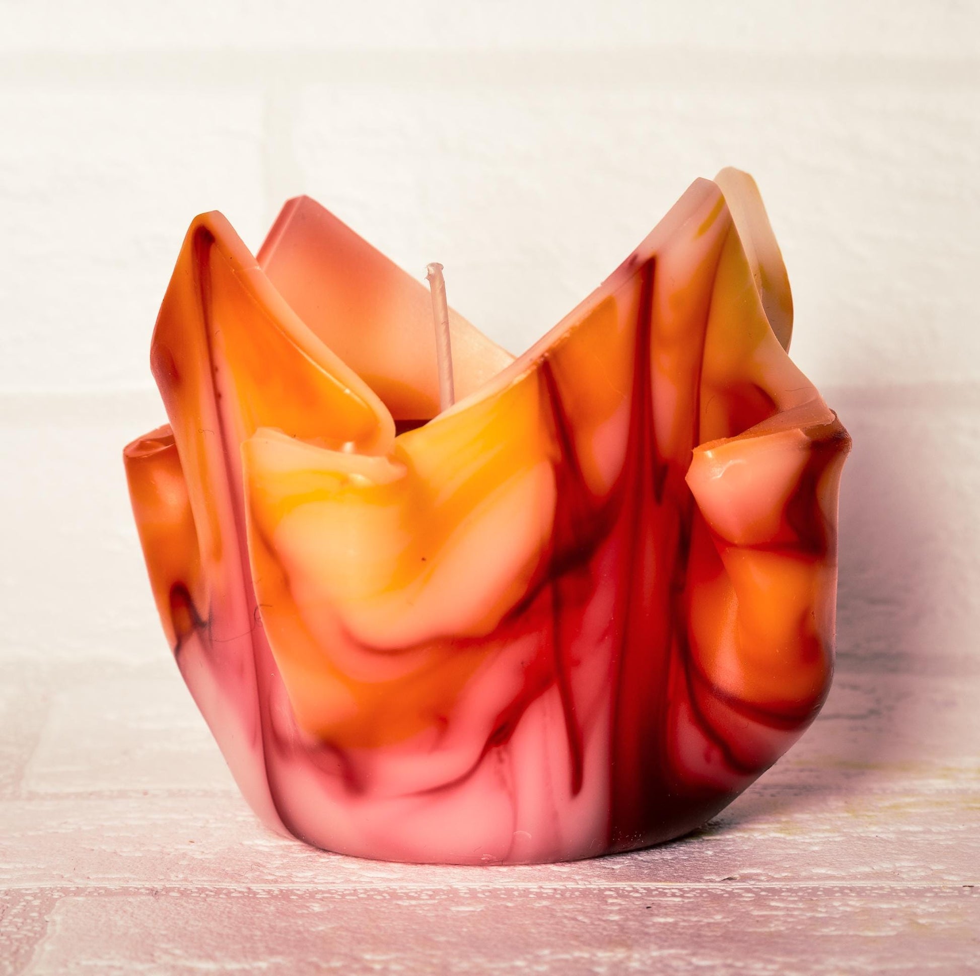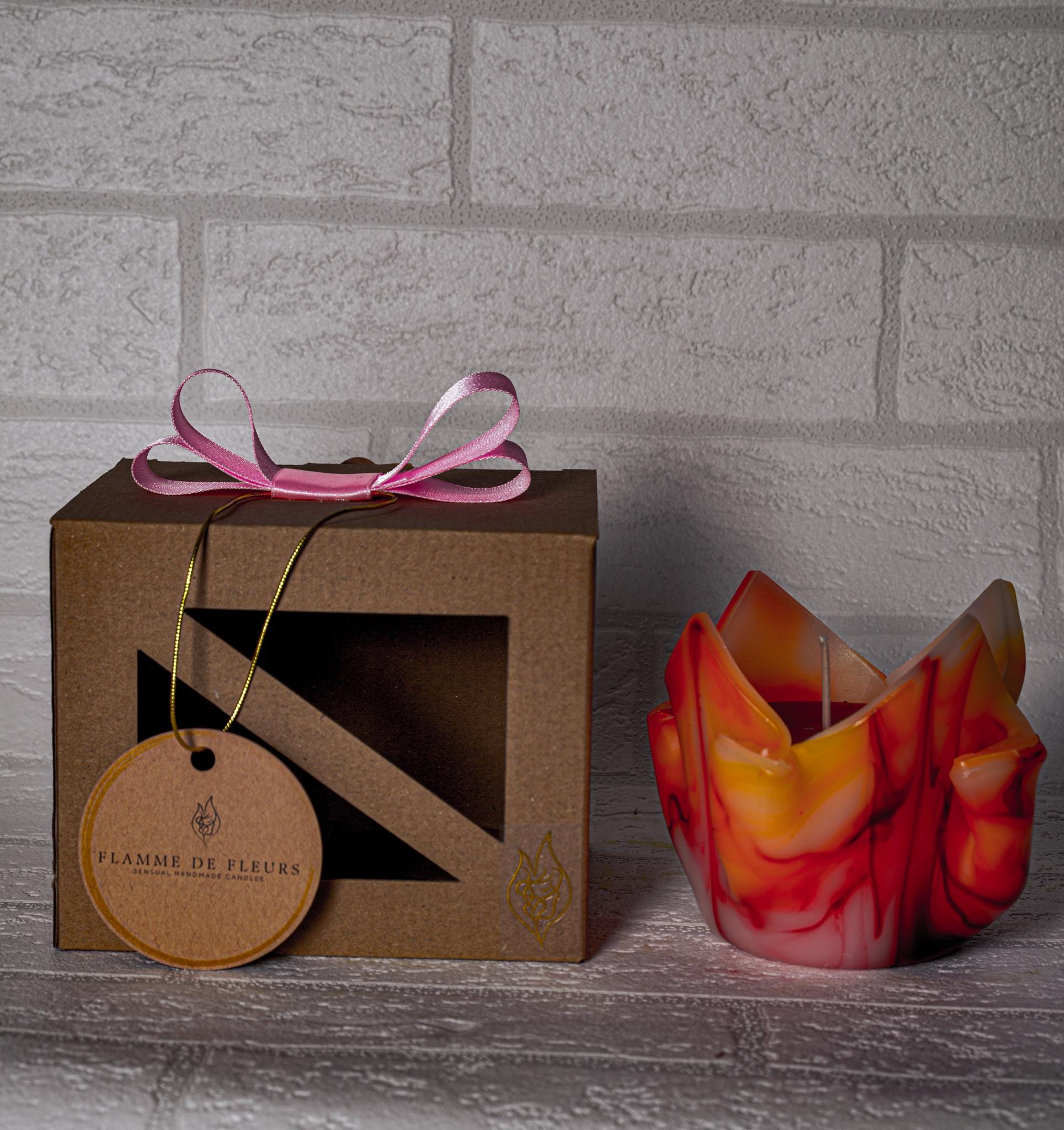 Kwiatowa, geometryczna, minimalistyczna, kolorowa, pomarańczowo-czerwona ręcznie robiona świeca zapachowa - ekskluzywny prezent okazjonalny