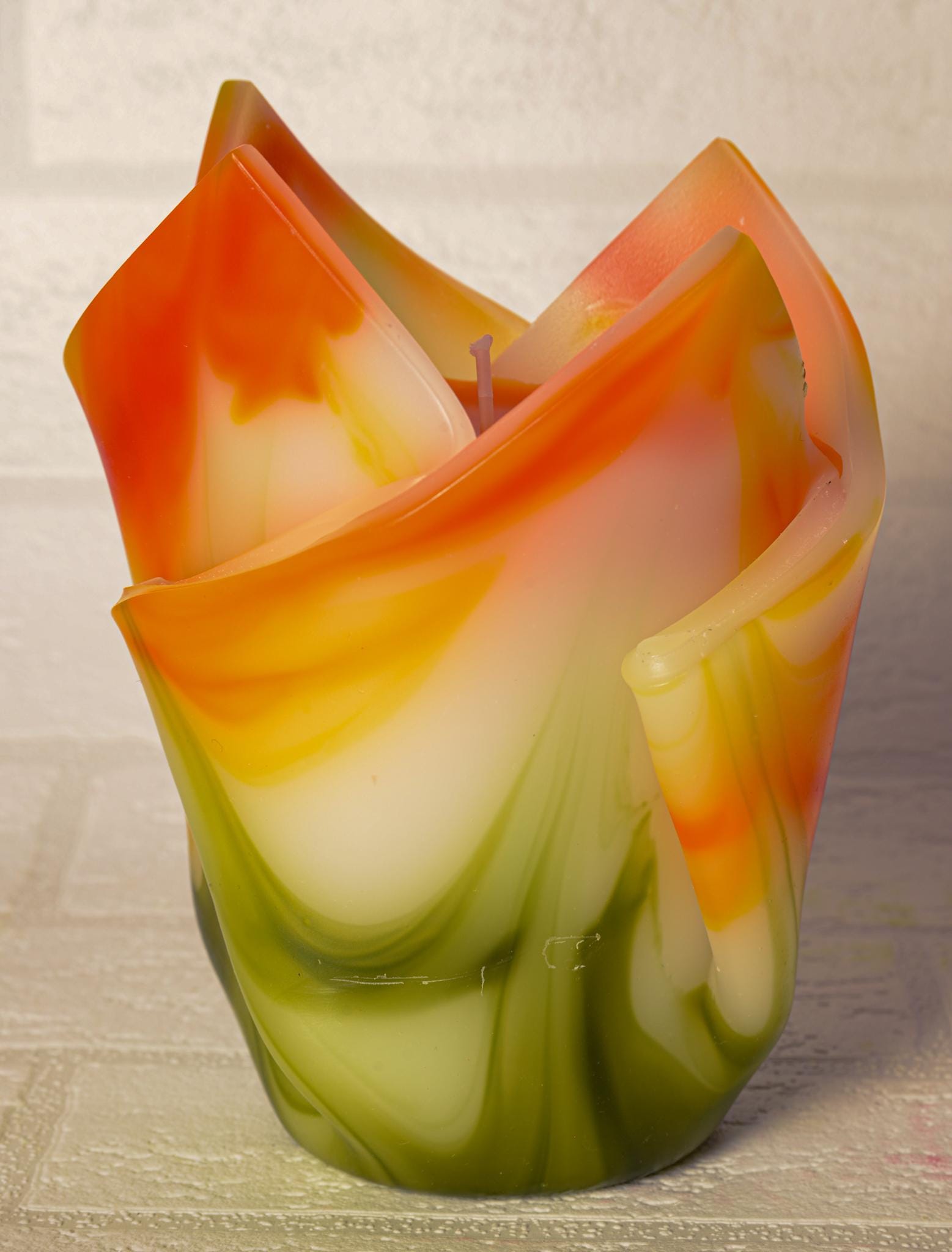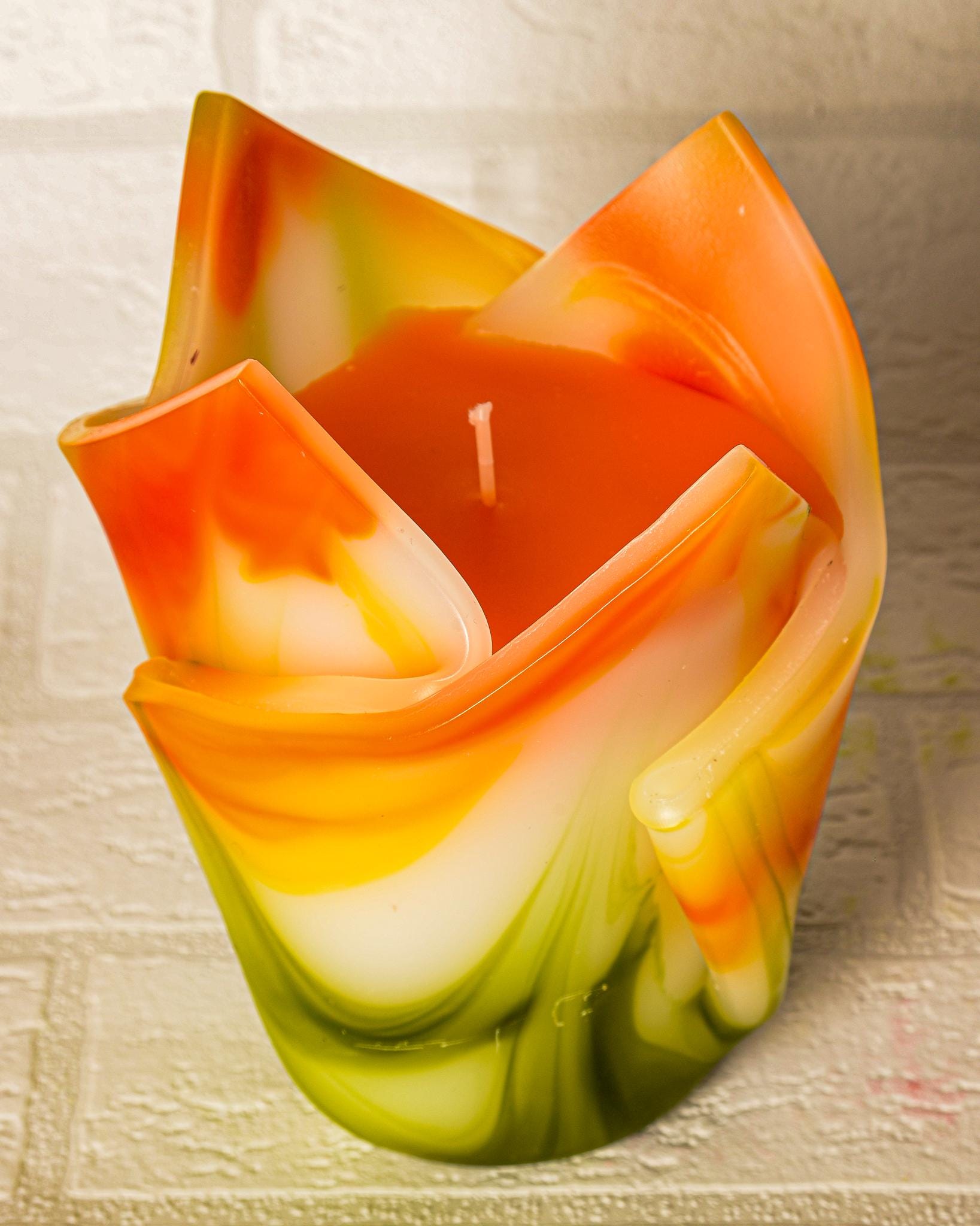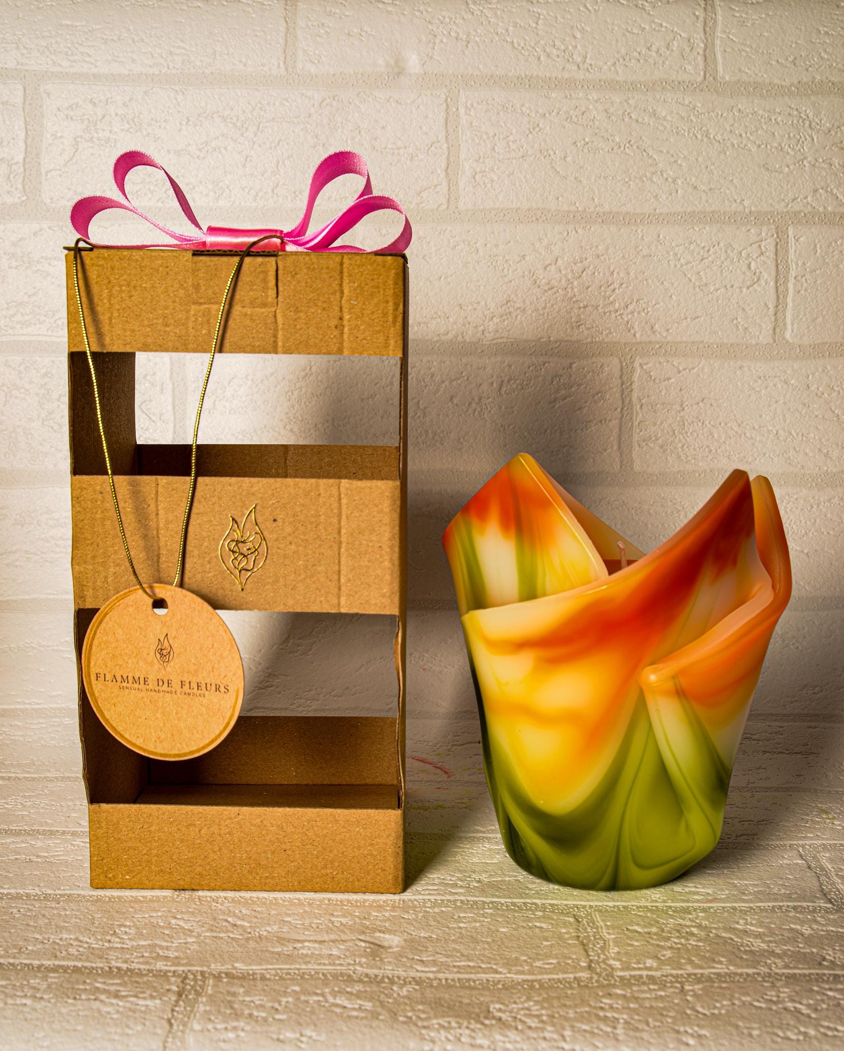 Kwiatowa, geometryczna, minimalistyczna, kolorowa, ręcznie robiona świeca zapachowa - pomarańczowo-zielona, relaks - 180h